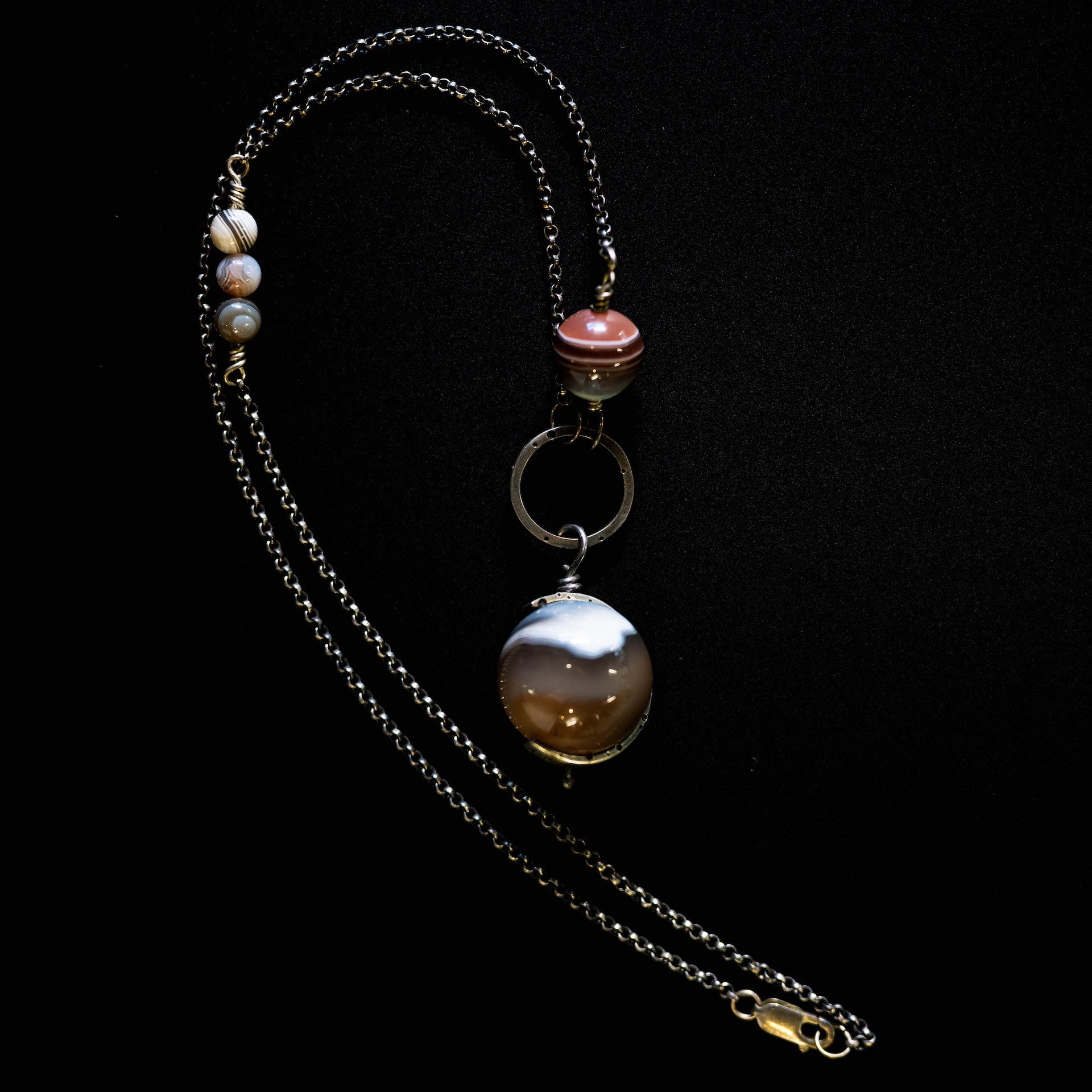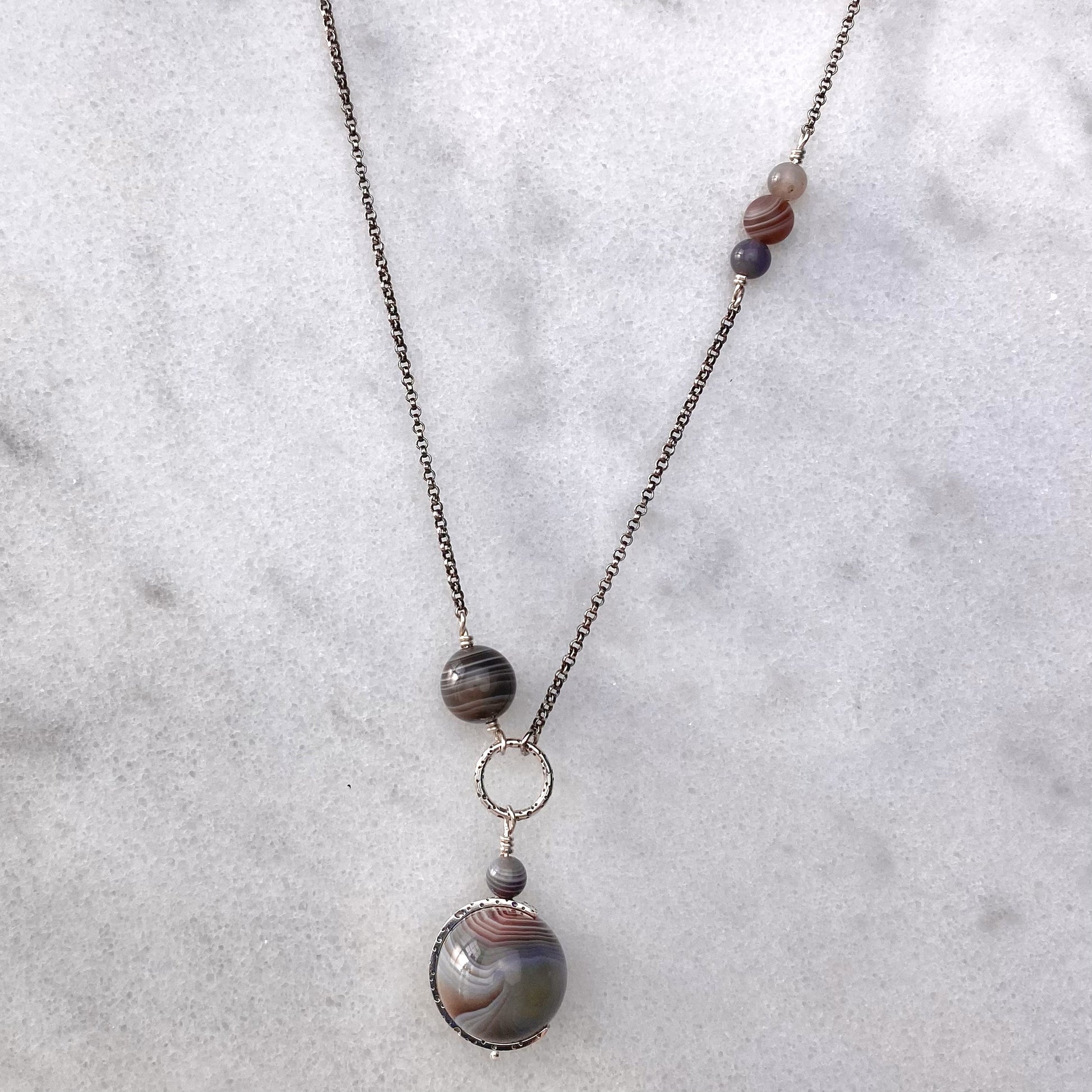 - Mystical, banded Botswana agate suspends from a asymmetric sterling silver chain and hand-fabricated elements