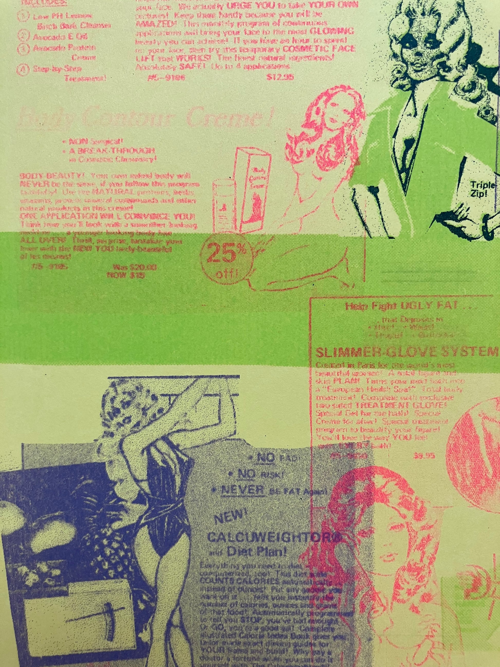 8.5" x 11" risograph collage of vintage thinspo taken from a late 70s lingerie catalog.