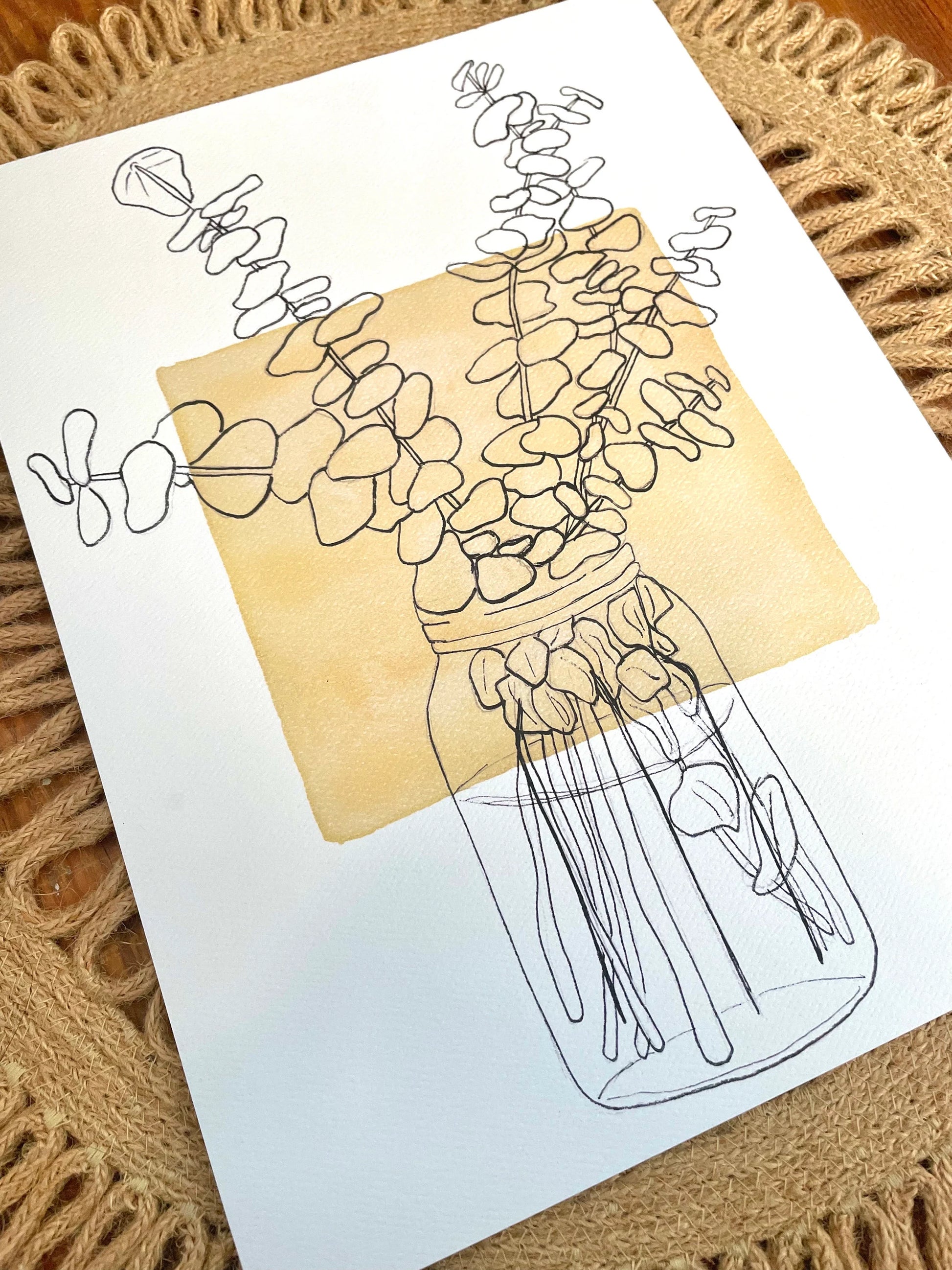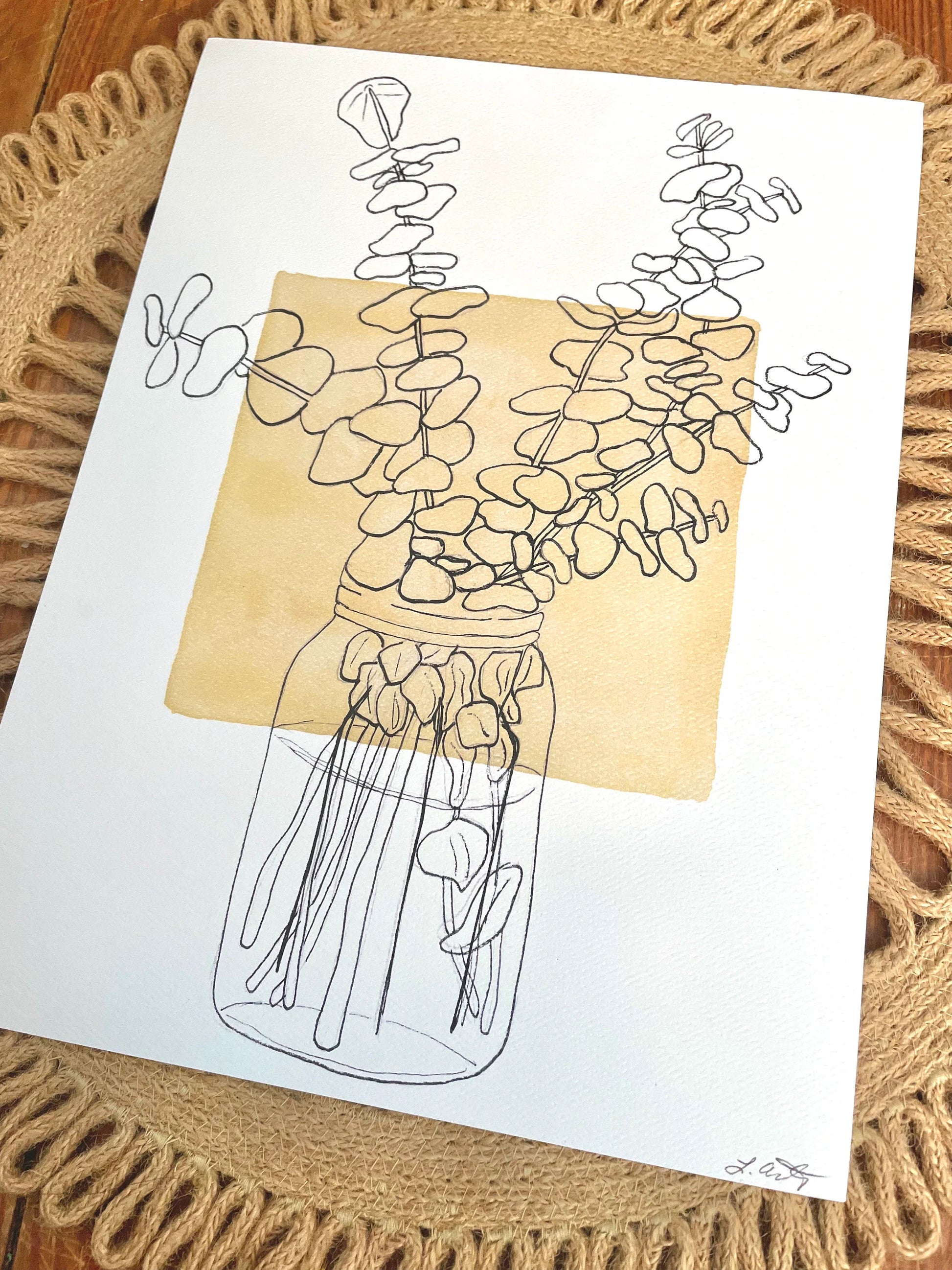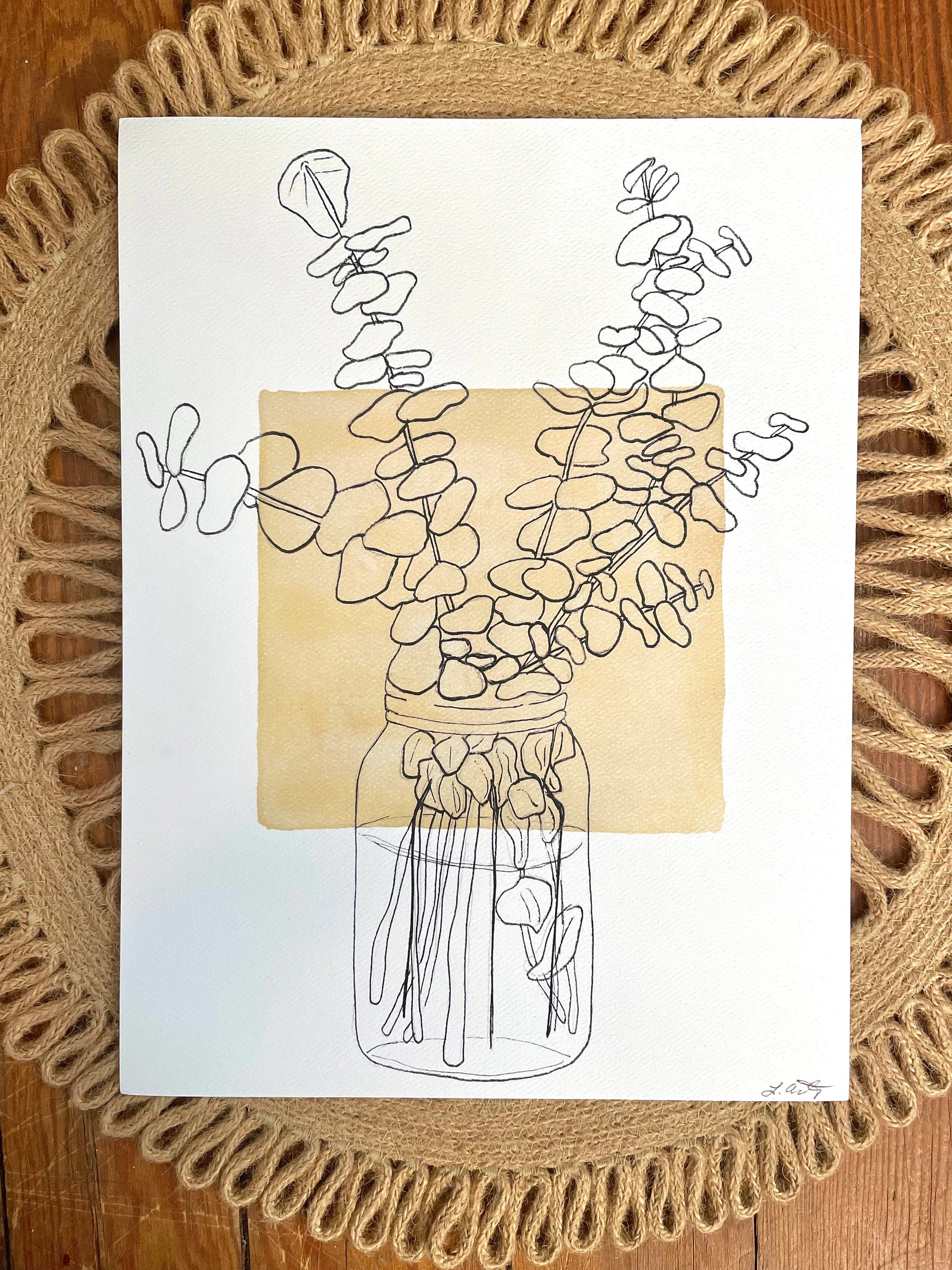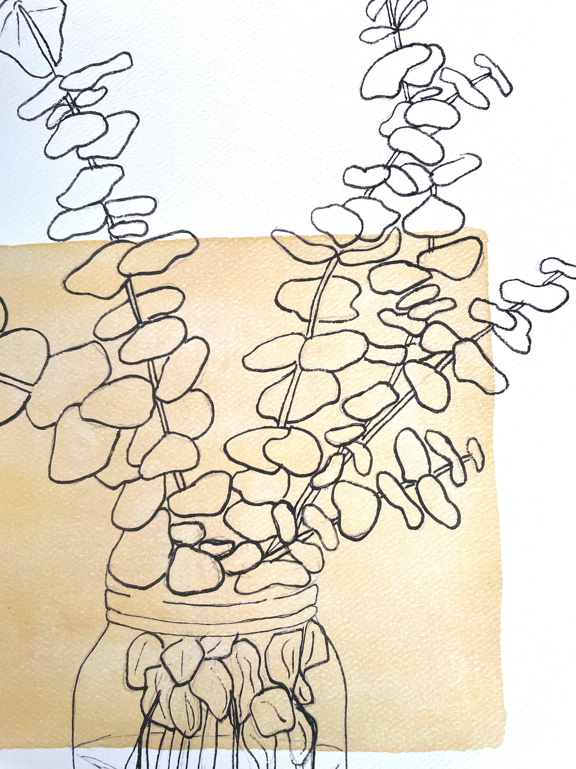 This is a print of an original 9x12" piece of a eucalyptus drawn over watercolor.