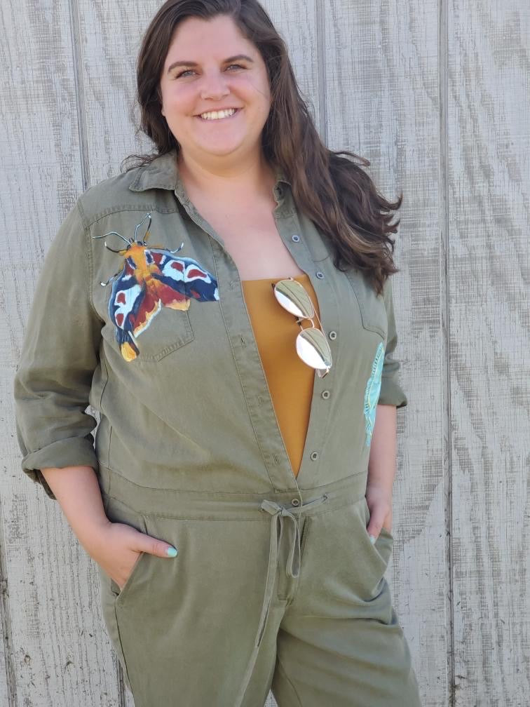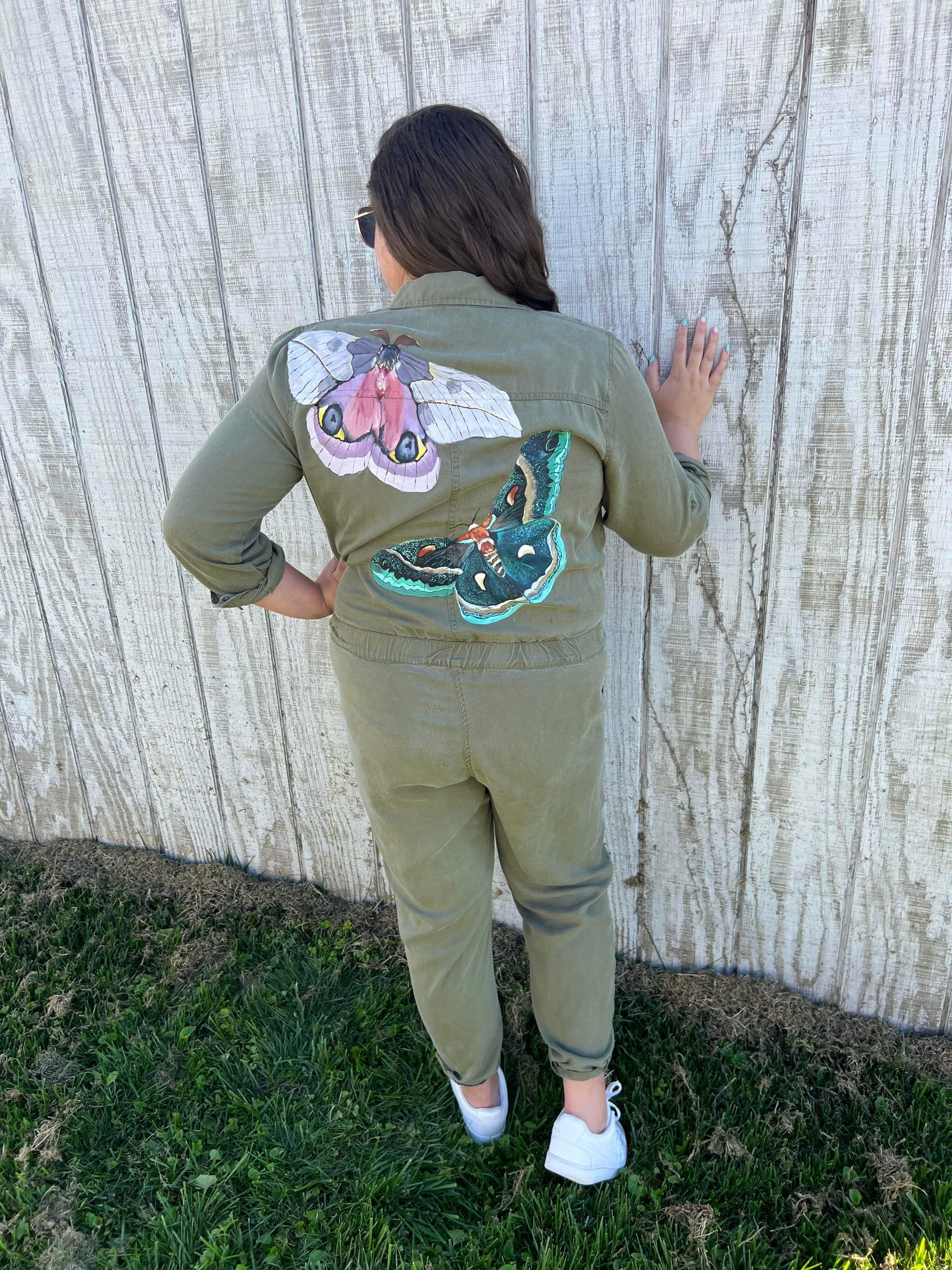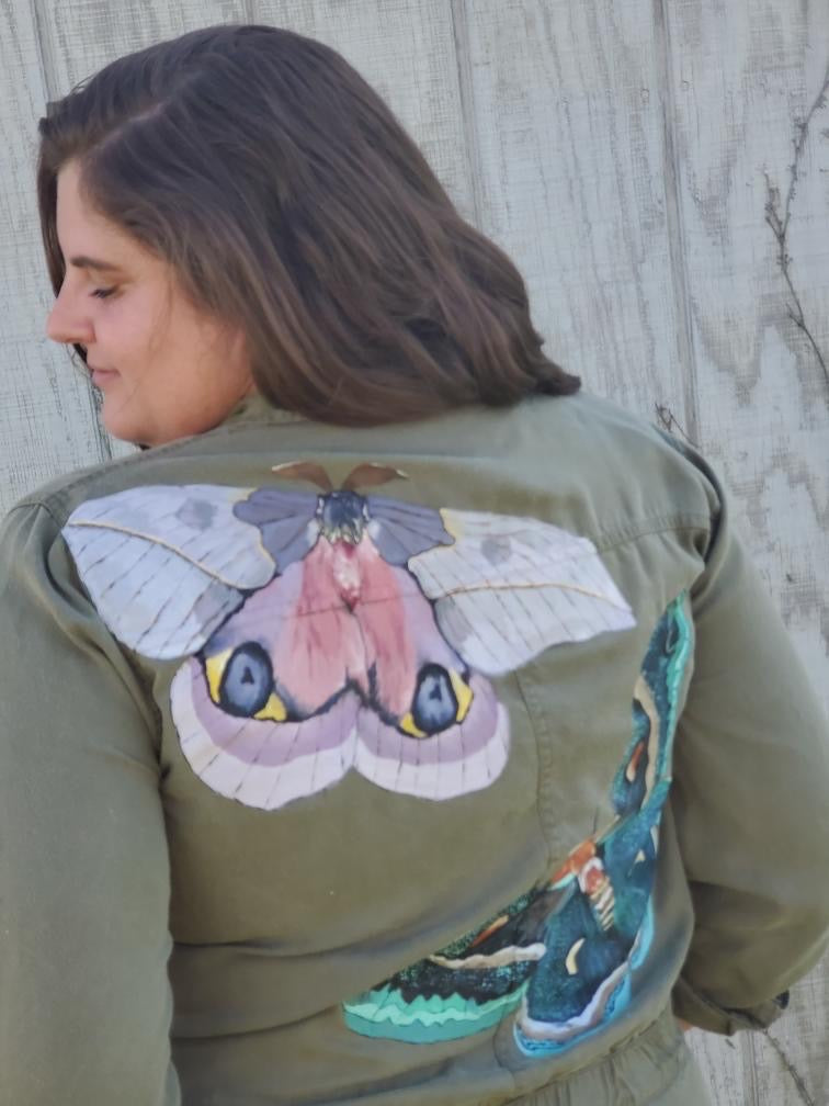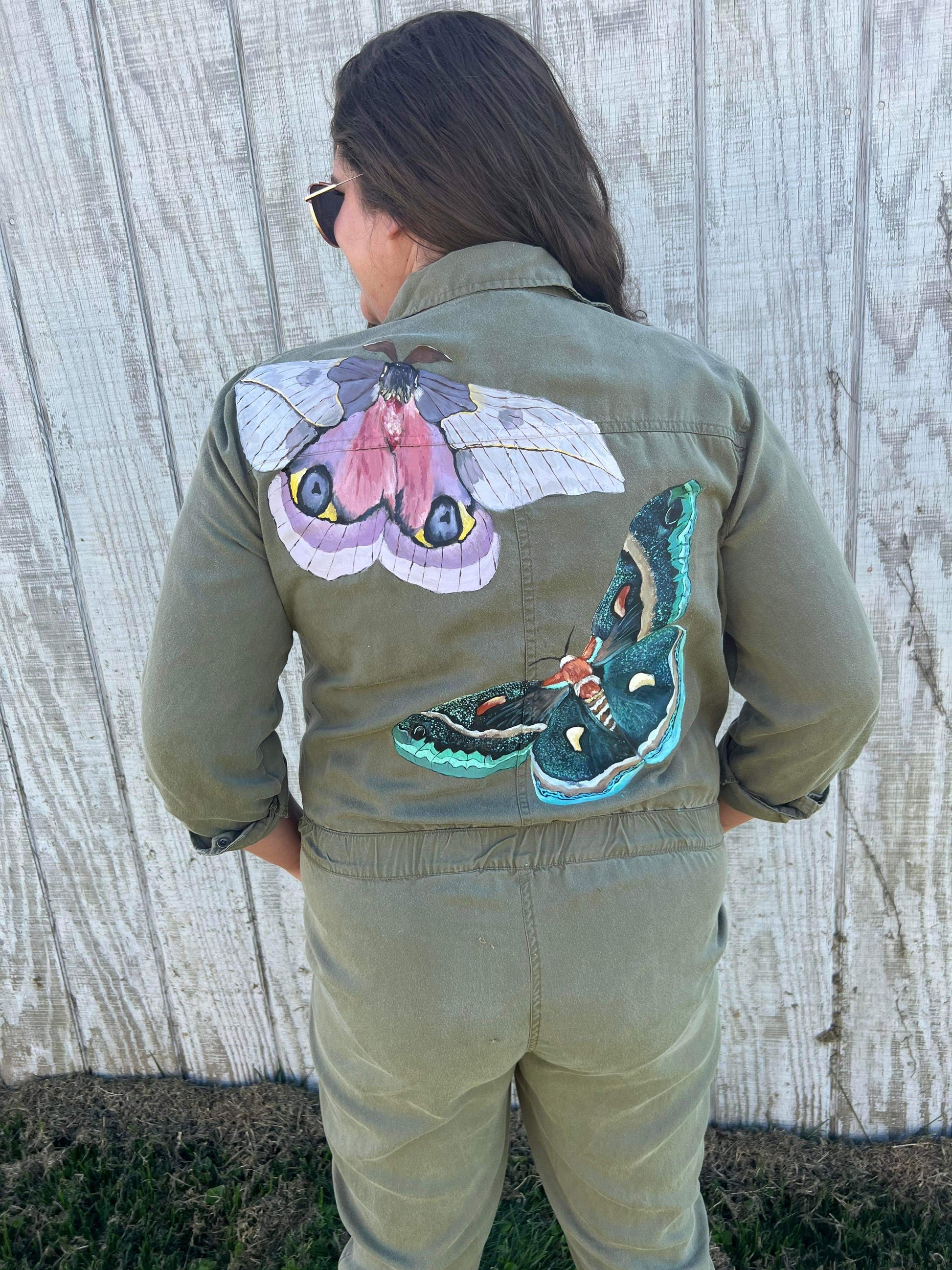 I have embellished this piece with two hand-painted moths in the front and two larger moths on the back.