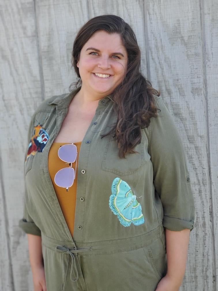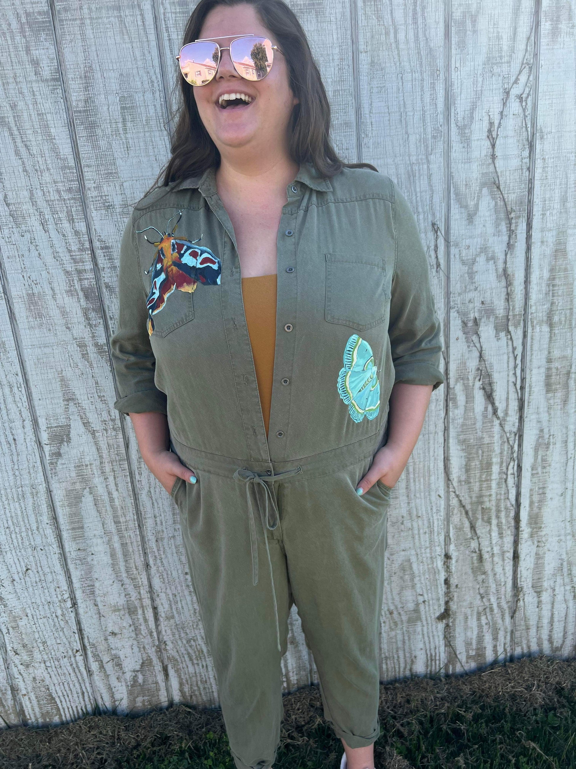 This XL olive green jumpsuit is light weight with buttons in the front and a waist tie. The jump suit also has roll up sleeves that button!