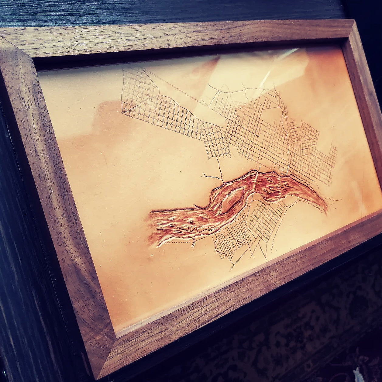 - Map of Richmond (circa 1865) hard-carved and pyrographed on vegetable tanned leather