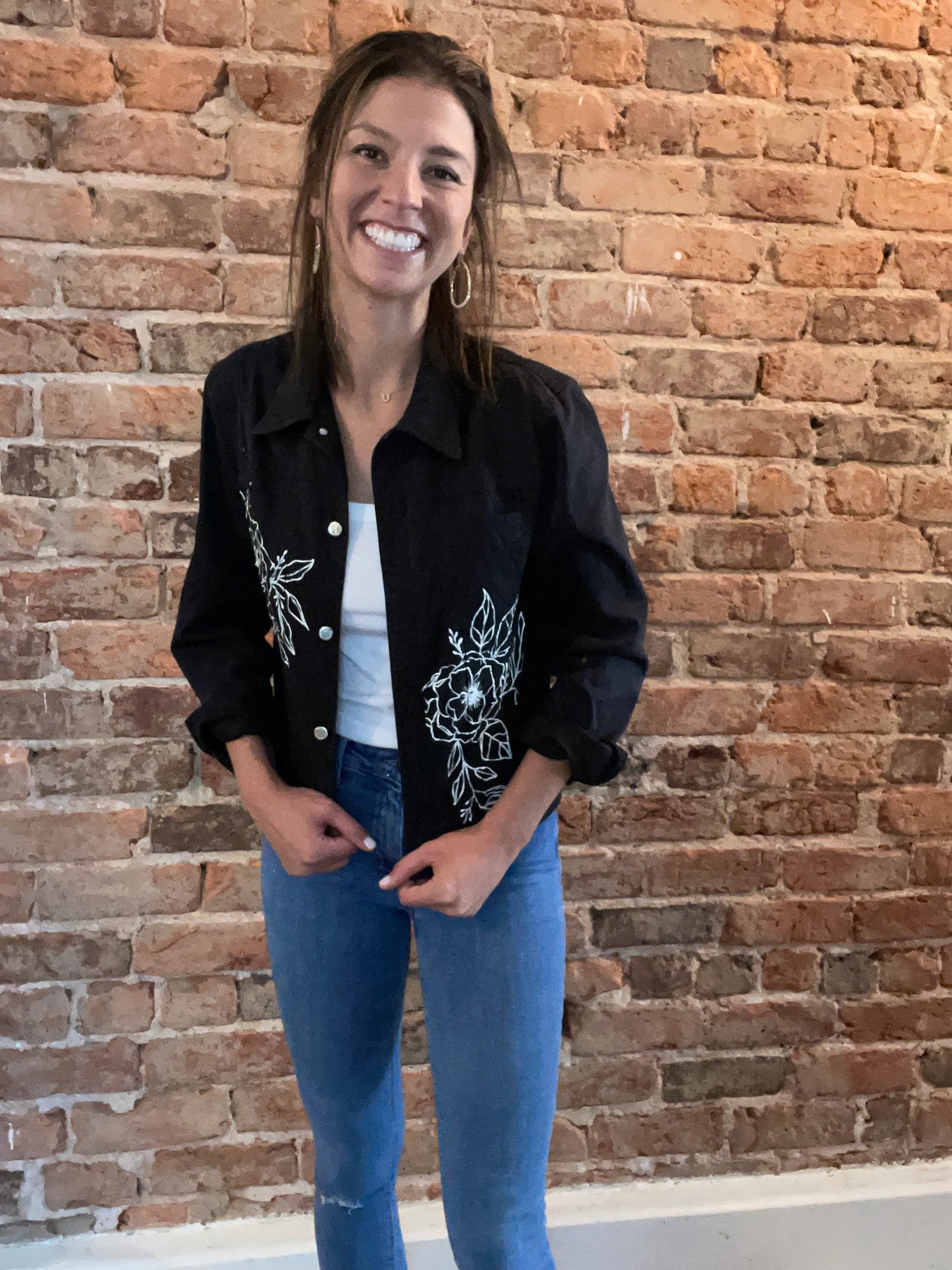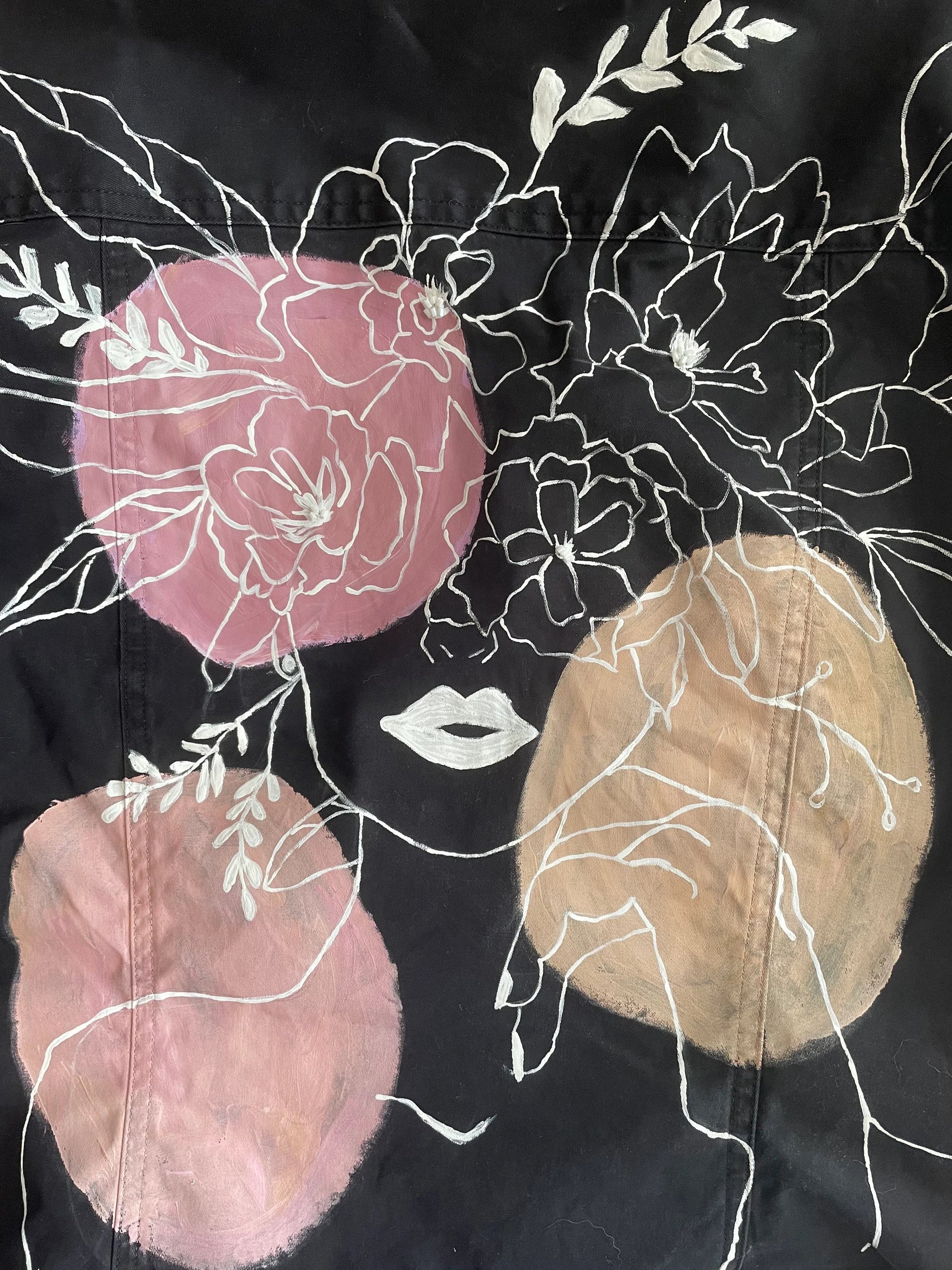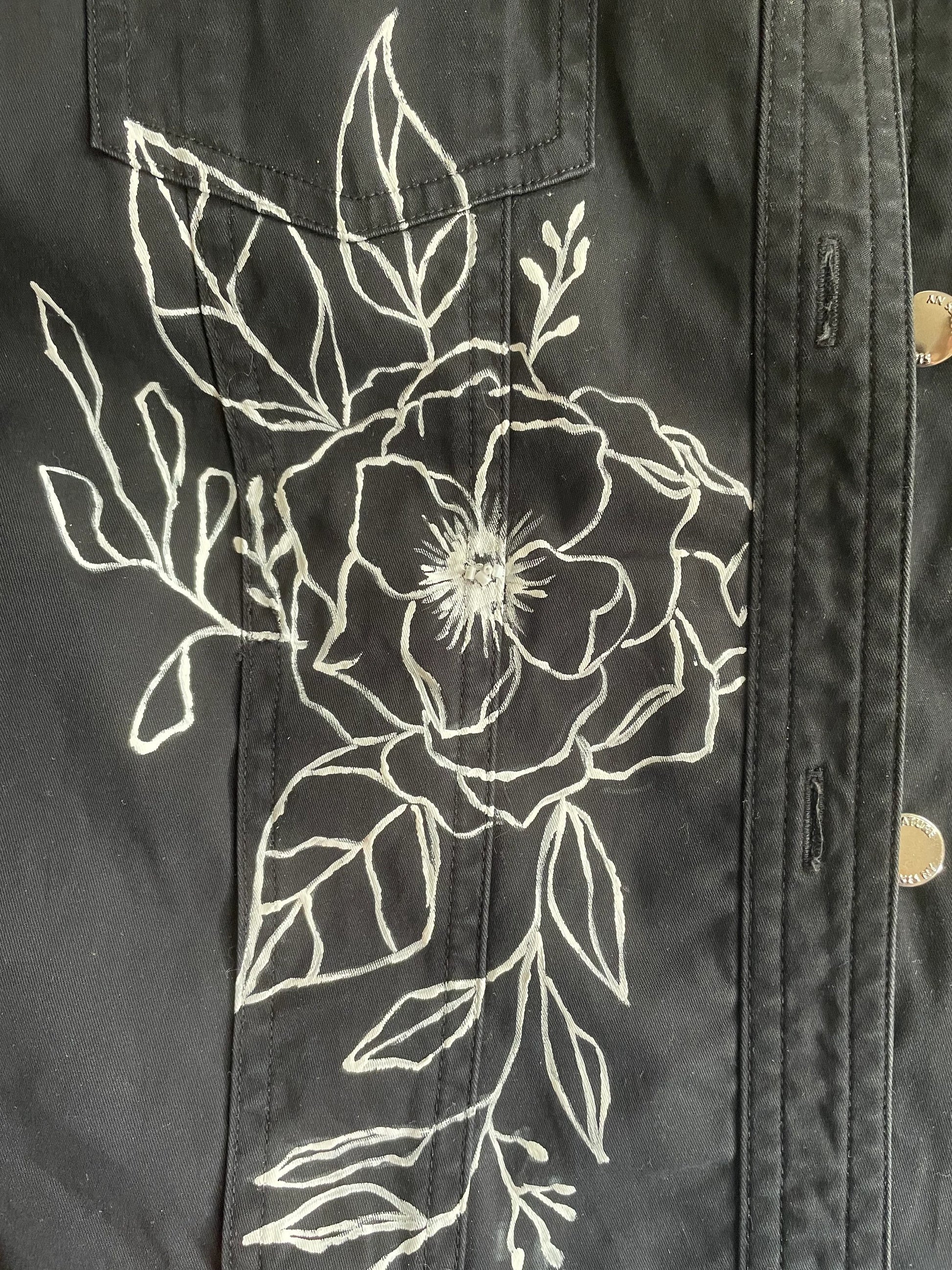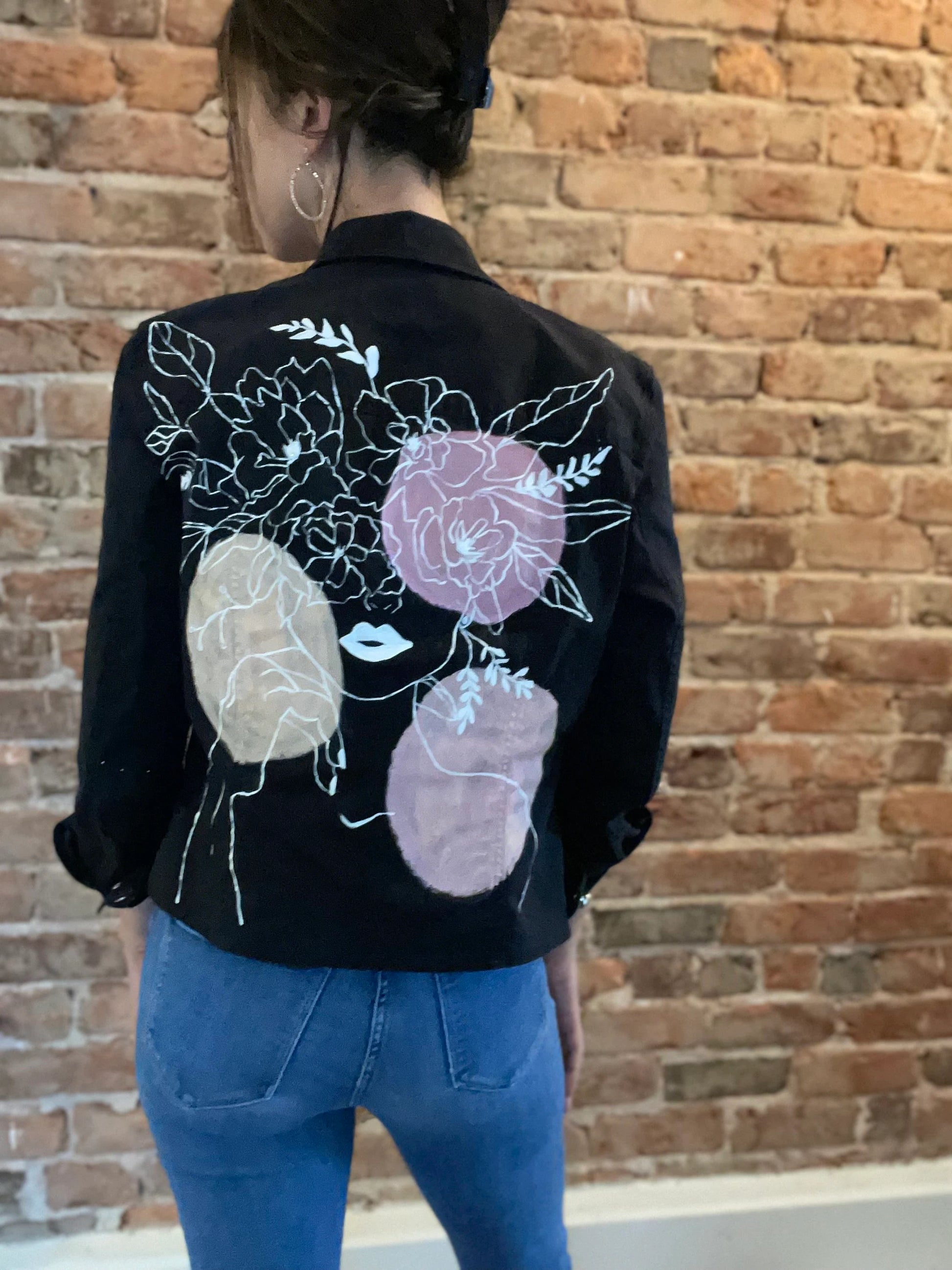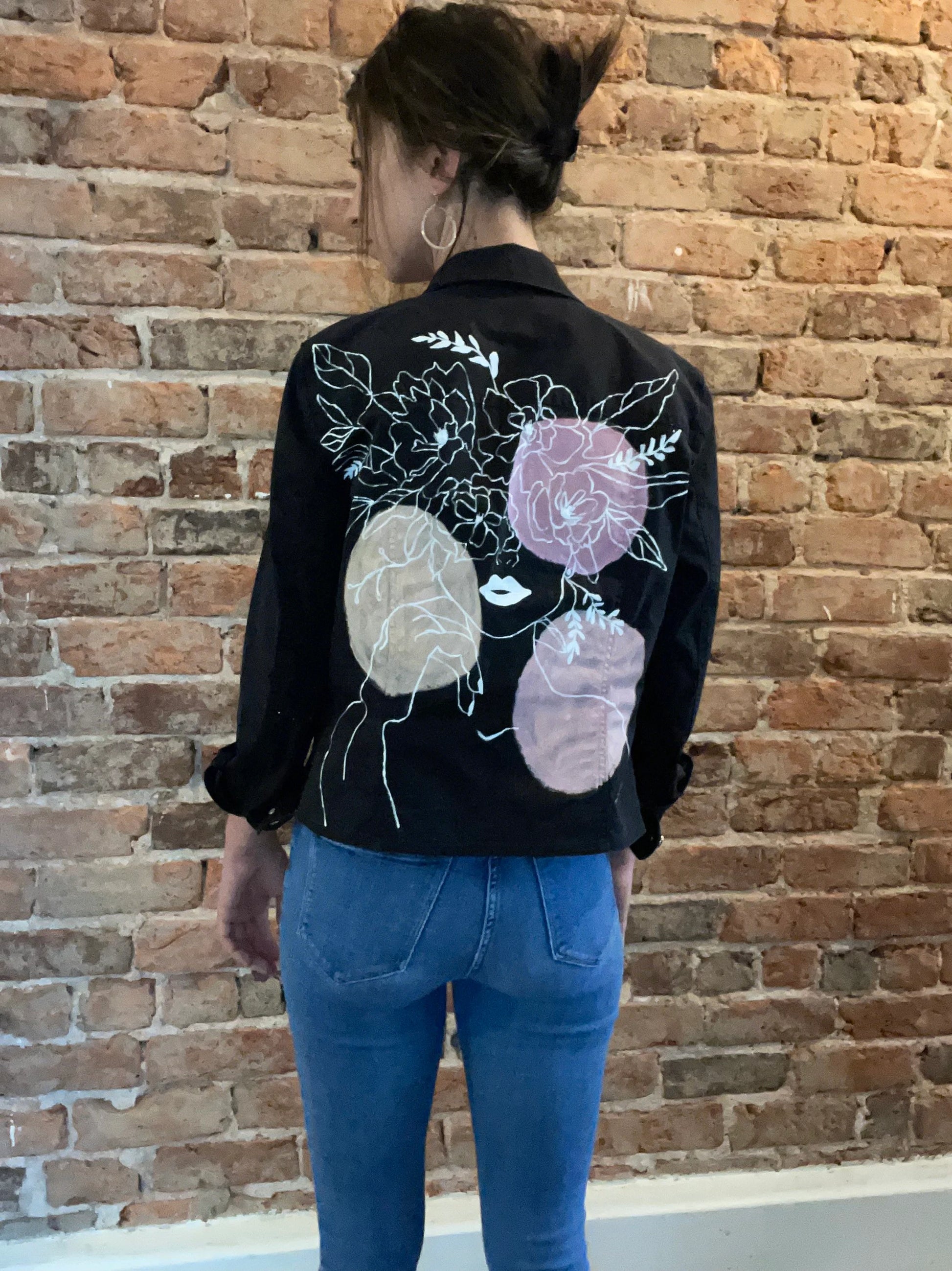 This upcycled black jacket was painted with acrylic paint, and embroidered with glass beads. This jacket is a size M.