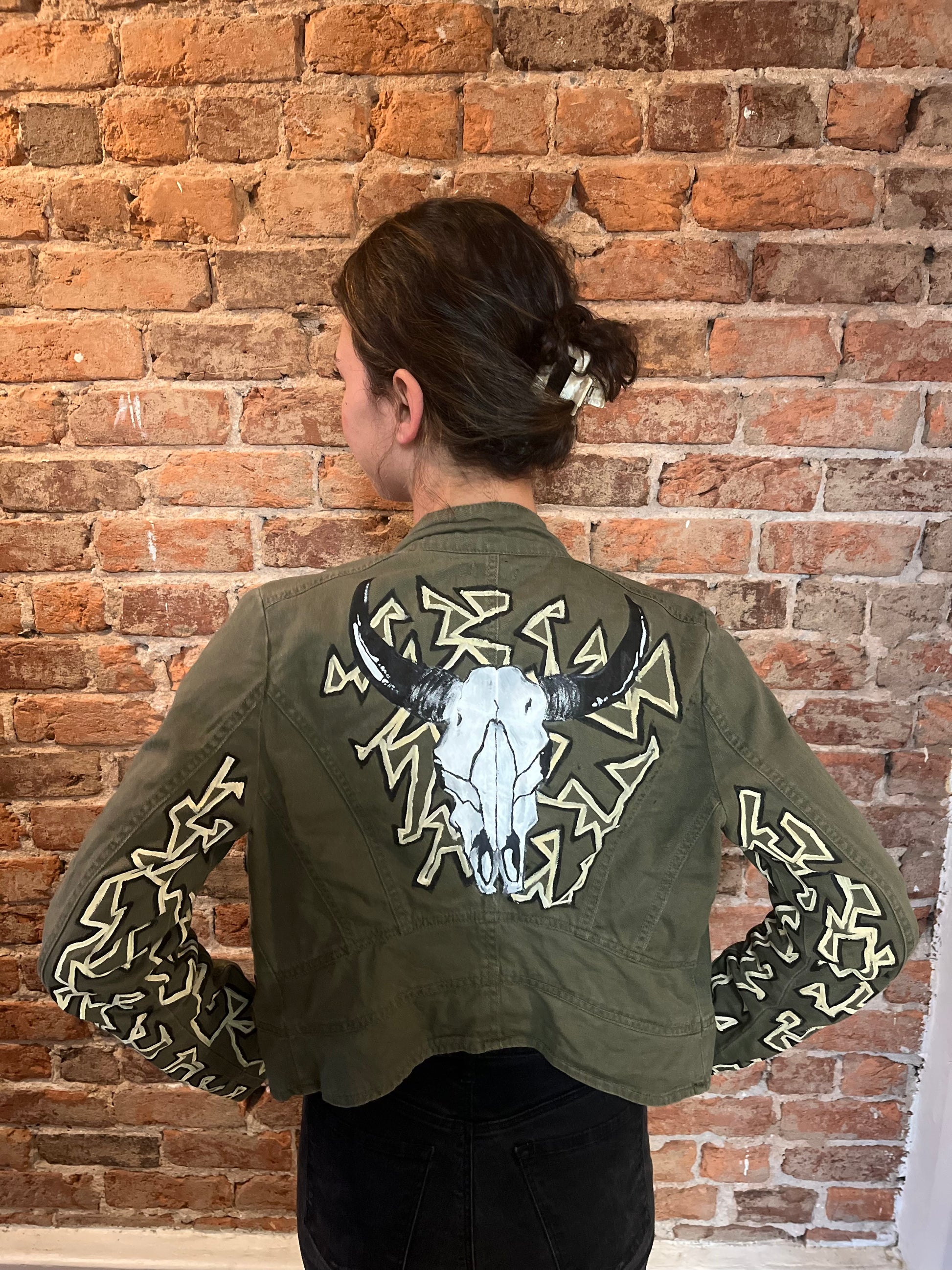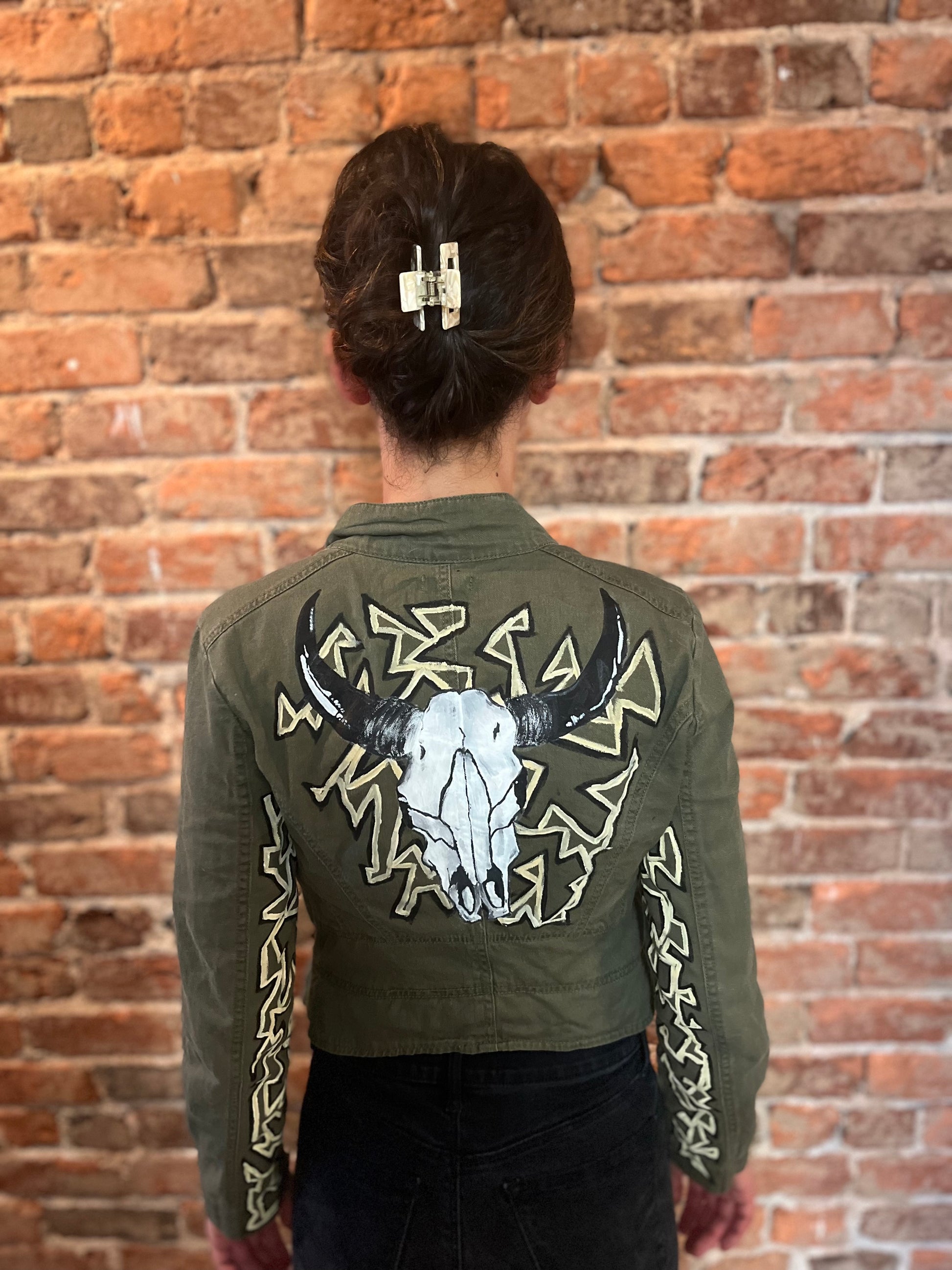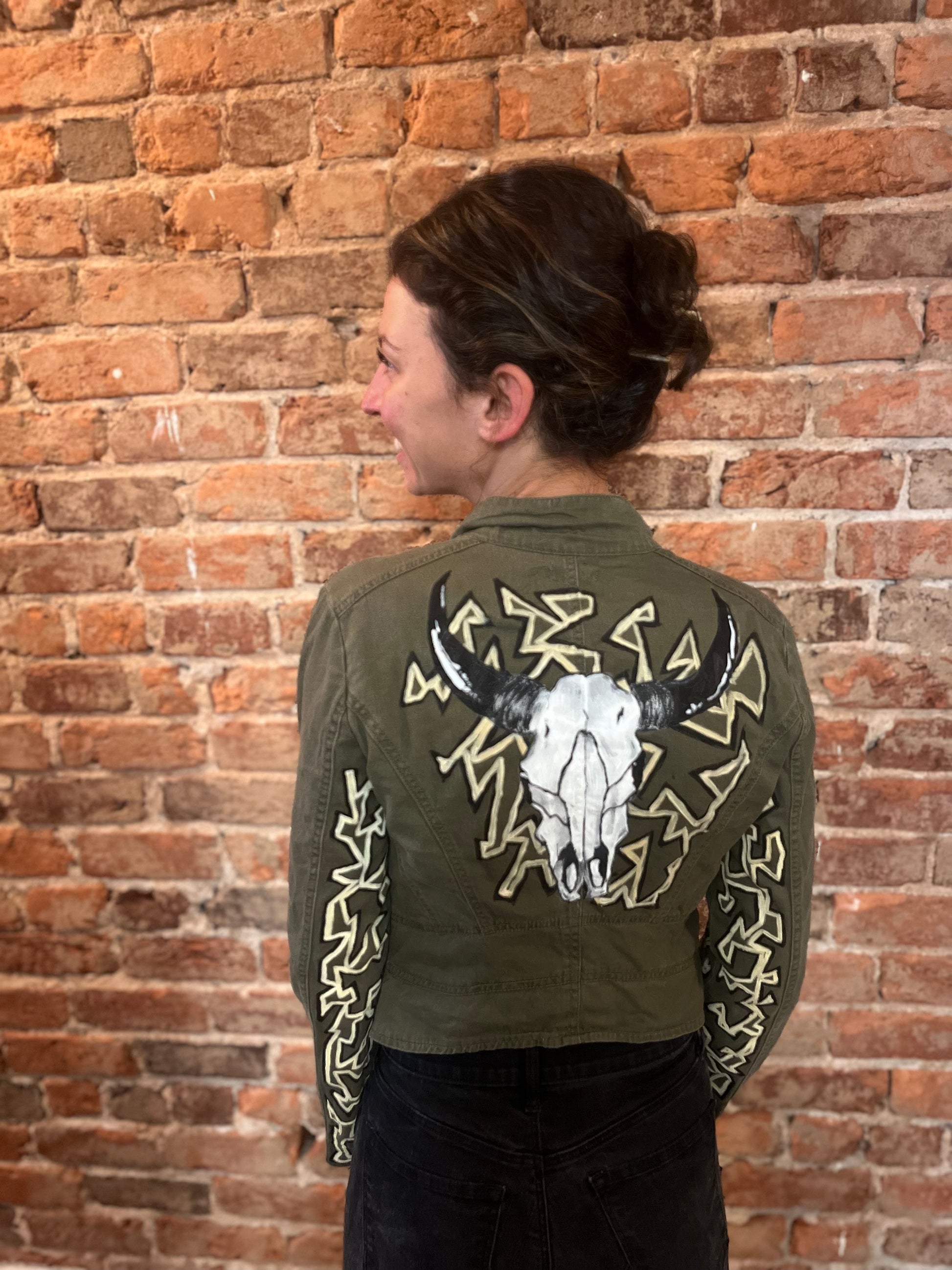 This medium size jacket has a beautiful shape that fits a woman's shape, and I wanted to ensure that my design was in line with the bodice of this jacket. That is how I arrived at the abstract background in the back.