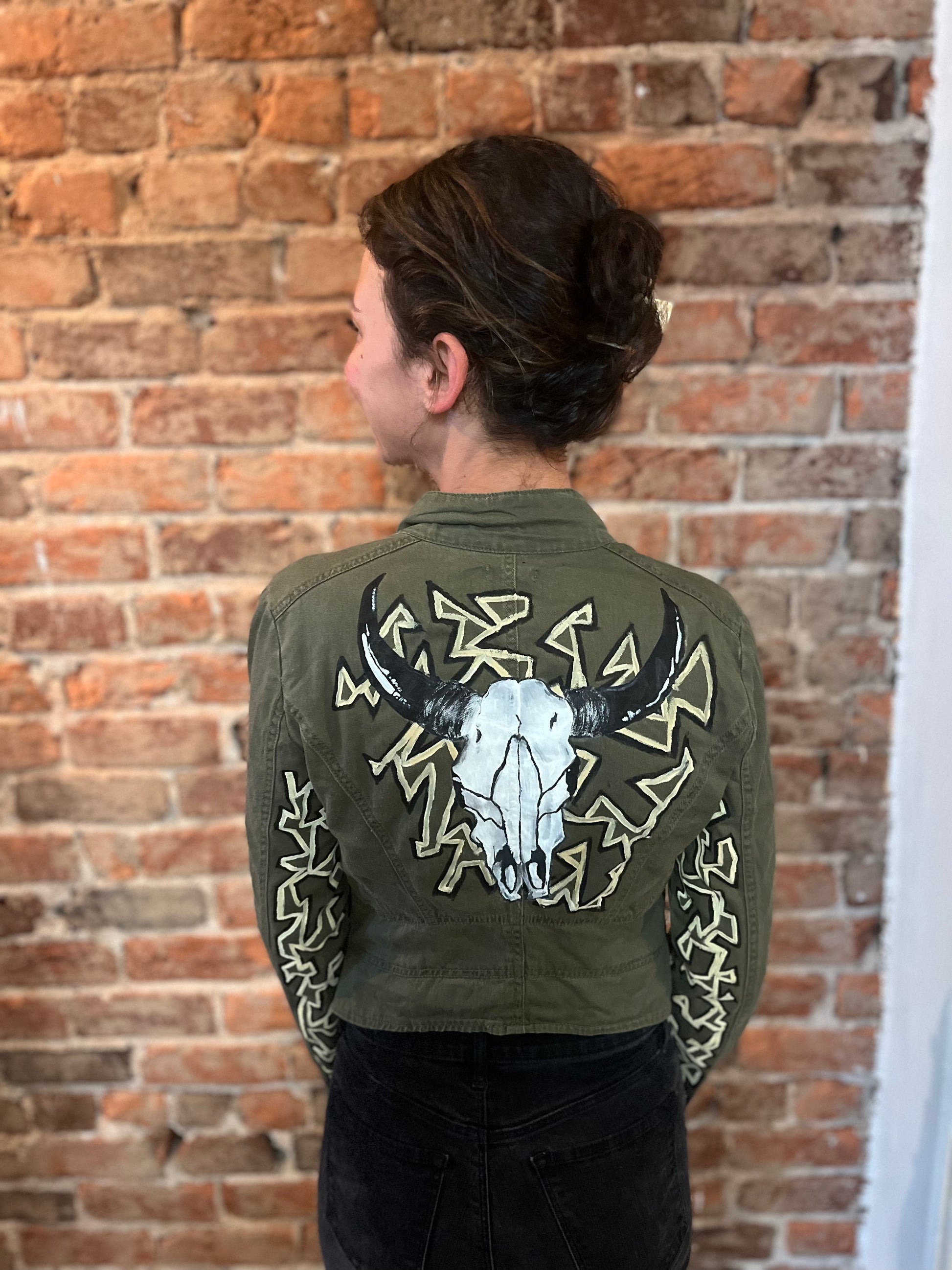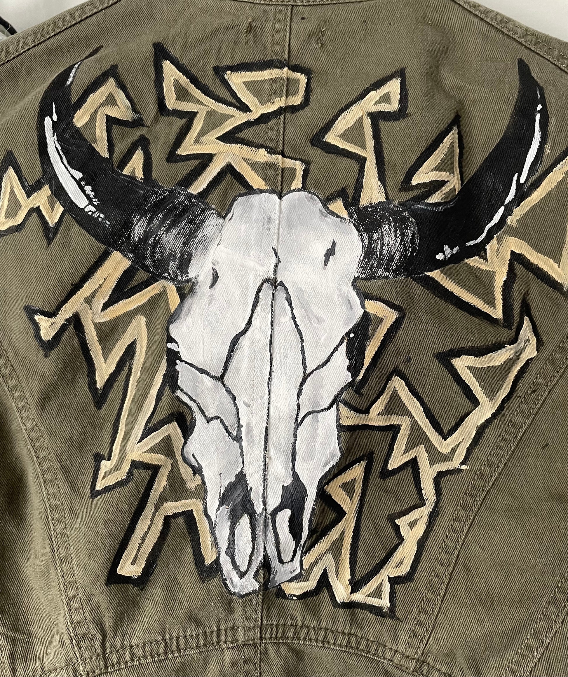 I also followed the same pattern underneath the sleeves, to give it some additional movement from the front. I landed on the skull once I had painted the abstract line, and painted both black and off-white. The skull was also painted in acrylic paint and gives a strong sense of power.