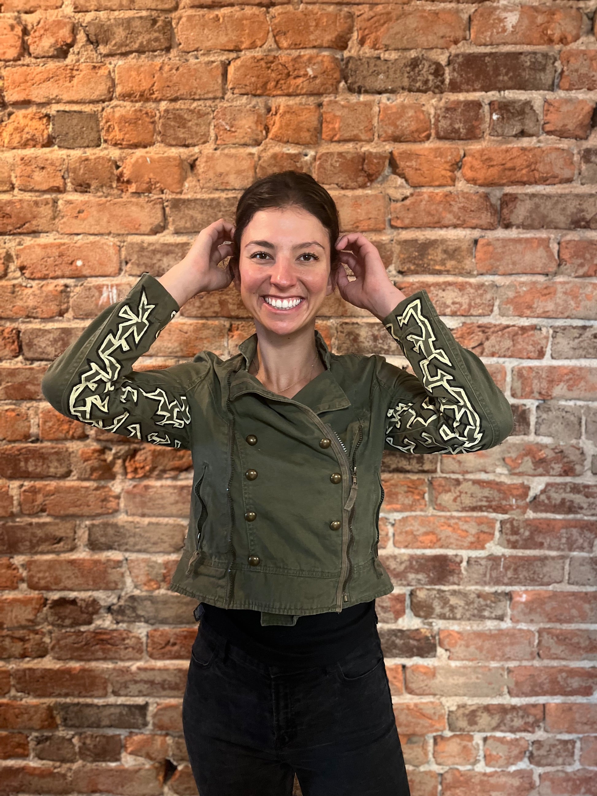 This olive green jacket is light weight and comes with beautiful embellishing on the front, with a zipper that zips on the side.