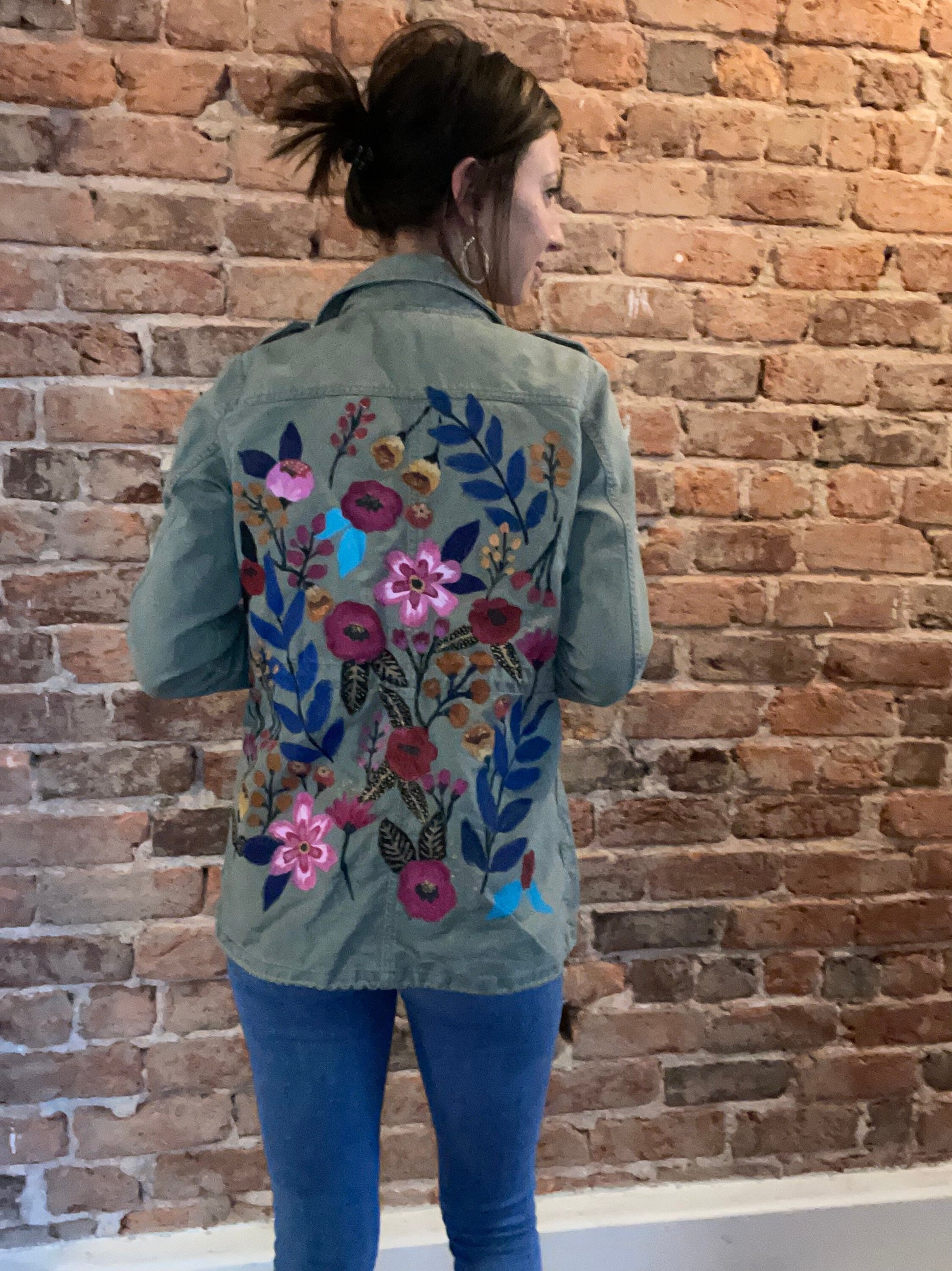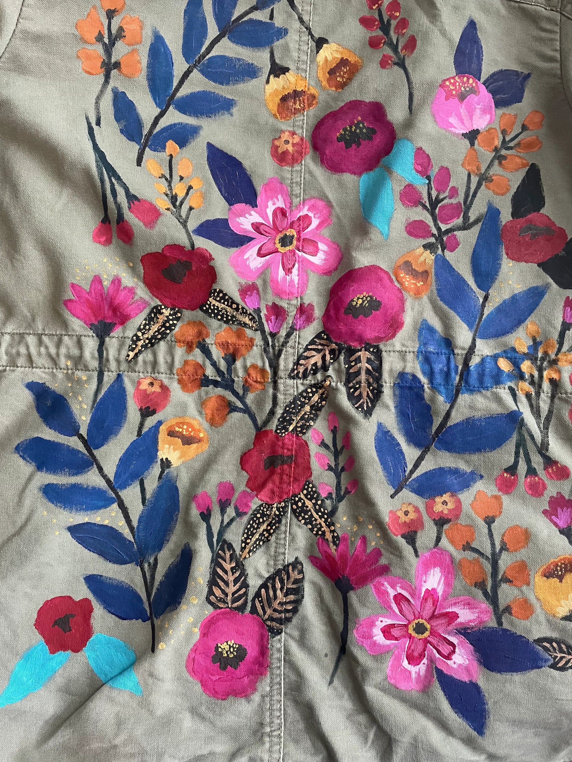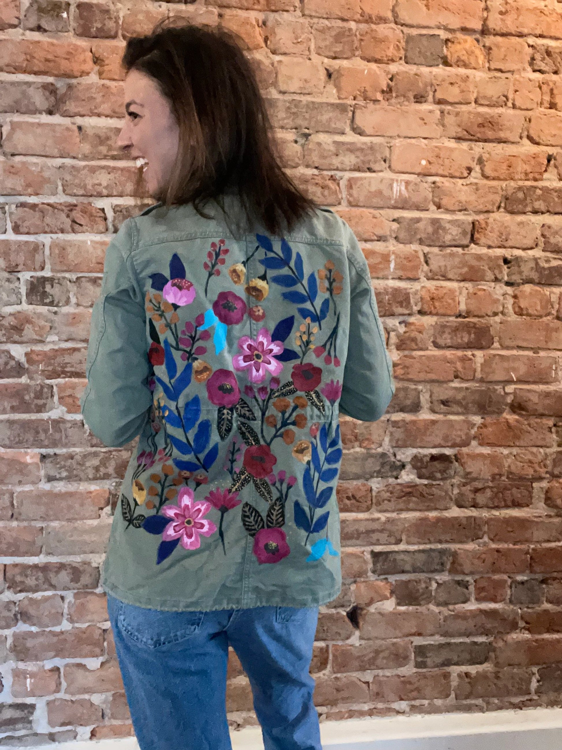 This upcycled olive green jacket was painted a happy floral scape on the back and front pockets in acrylic paint.