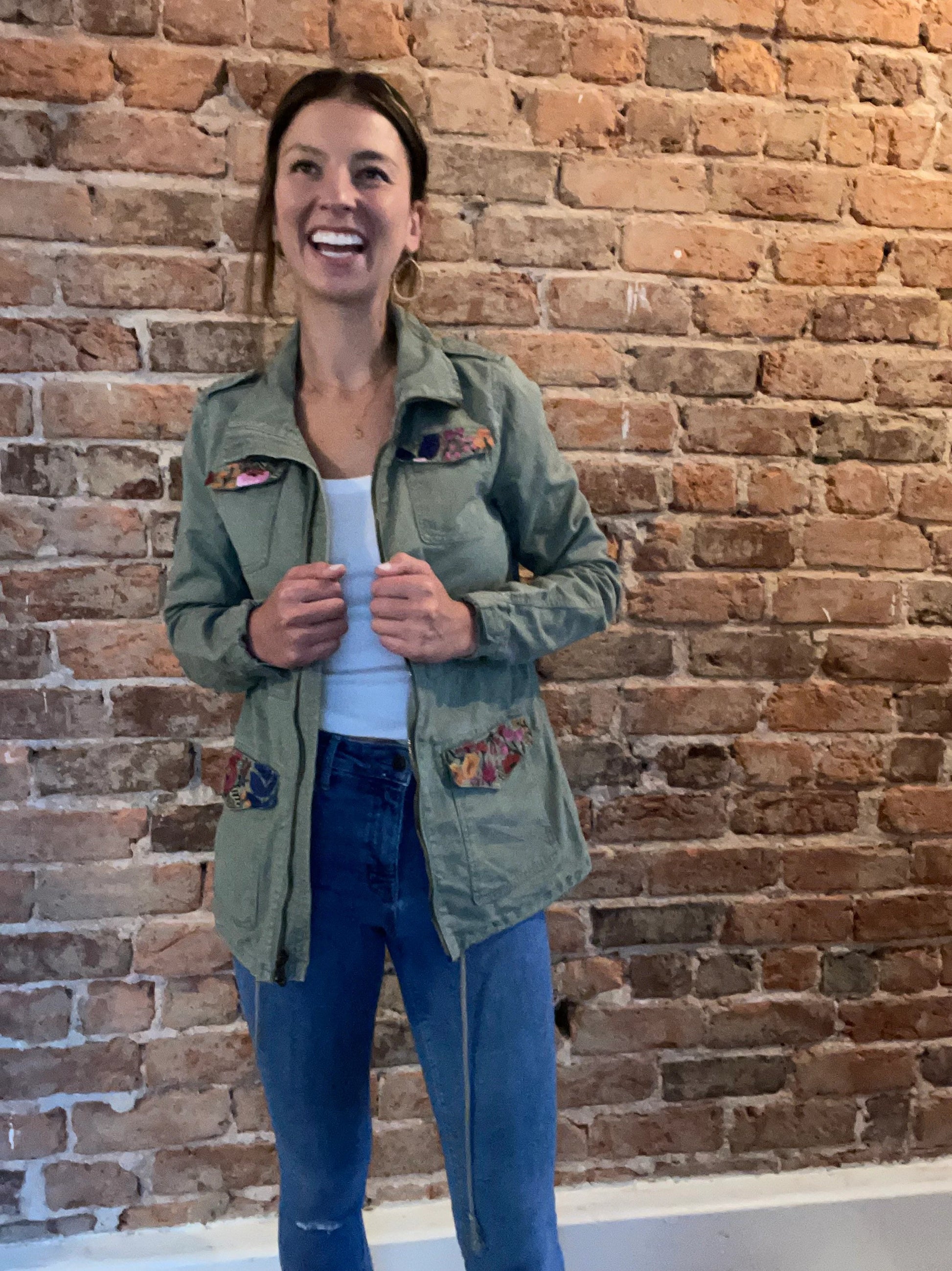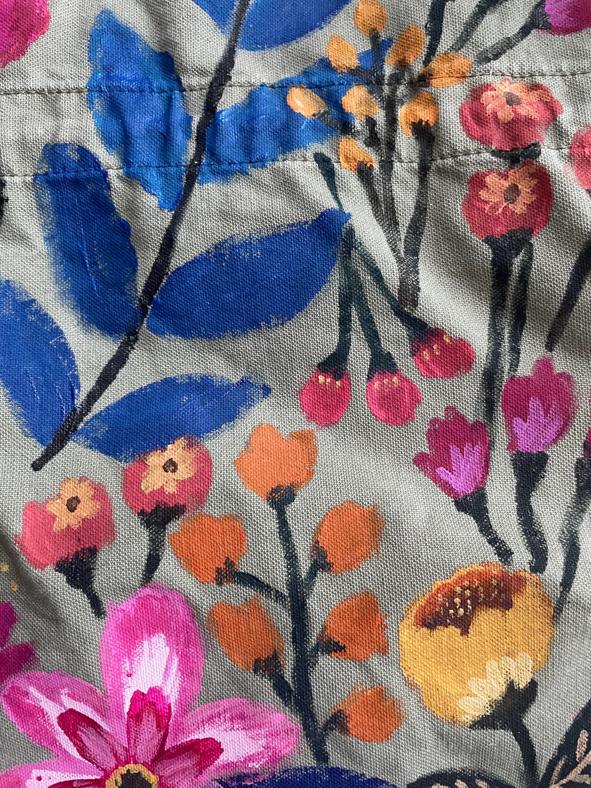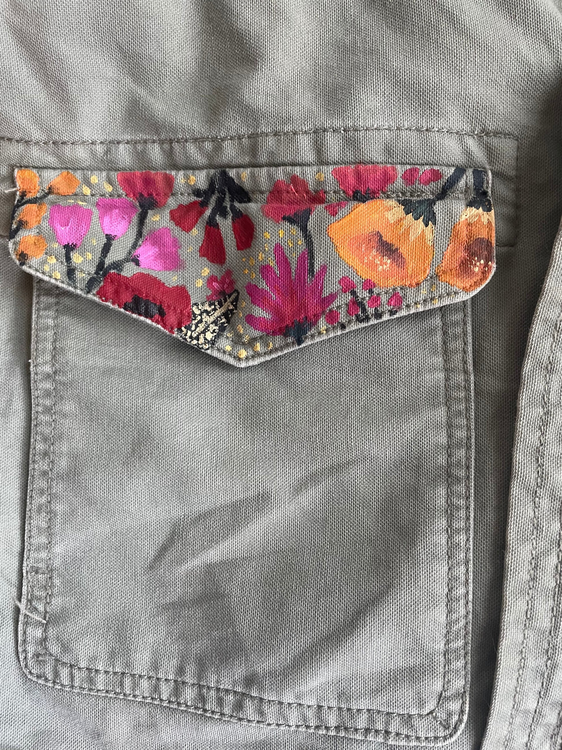 This upcycled olive green jacket was painted a happy floral scape on the back and front pockets in acrylic paint.